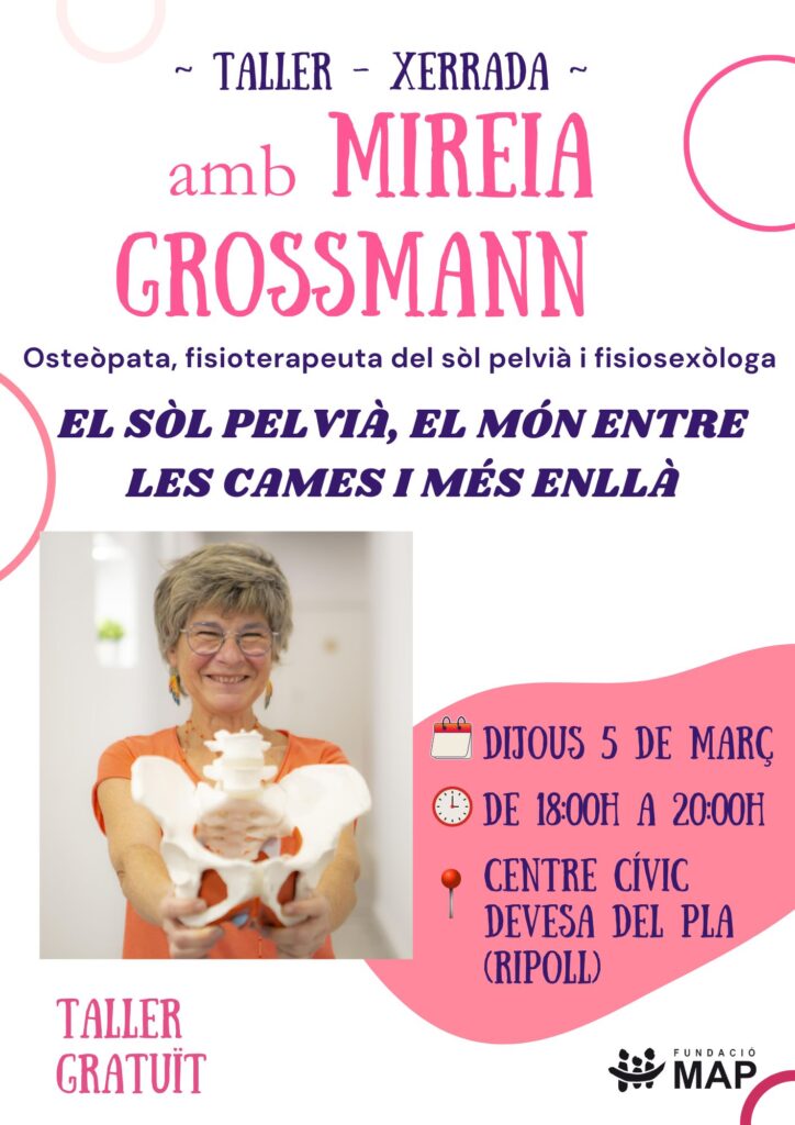 Un dels actes destacats tindrà lloc dijous a la tarda al Centre Cívic Devesa del Pla, a Ripoll. Es tracta del taller-xerrada “El sòl pelvià, el món entre les cames i més enllà”, a càrrec de Mireia Grossmann, osteòpata, fisioterapeuta especialitzada en sòl pelvià i fisiosexòloga.