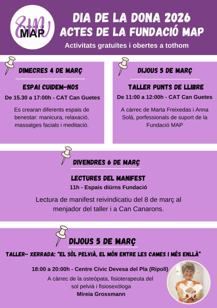 Amb motiu del 8 de març, la Fundació MAP ha preparat una programació especial per commemorar el Dia Internacional de la Dona 2026. Del 4 al 6 de març, l’entitat impulsa un conjunt d’activitats gratuïtes i obertes a tothom amb l’objectiu de fomentar el benestar, la reflexió i la participació comunitària.
